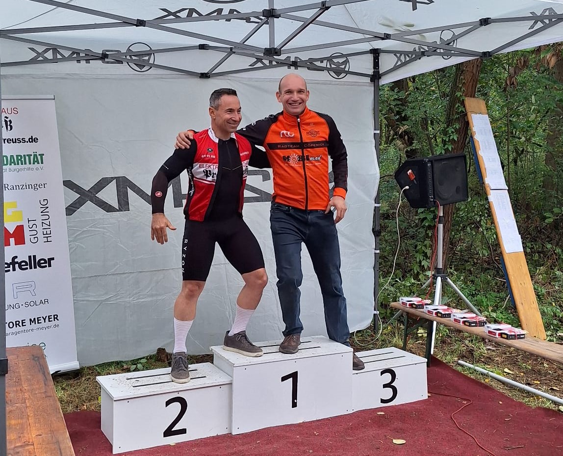 Zum Abschluss sprang auch Christian aufs Zeitrad. Nach dem anstrengenden Fläming-Race des vorletzten Tages, der eigentlich schon begonnenen Pause und dem Support der Kids mussten 15min Warmfahren reichen. Auf wohlbekannter Strecke ging es etwas zurückhaltend los, aber er fand gut rein und die Kraft reichte auch für einen immernoch annehmbaren Rückweg. So kam er nach 14:49 ins Ziel. Bei der Siegerehrung und leckerem Bratwurst-Abschluss kam für Christian dann etwas überraschend der Ruf auf den Seni2-Bronzeplatz, was nach durchwachsener Saison einen insgesamt mehr als versöhnlichen Ausklang markierte.